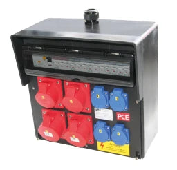 Vollgummi-Wandverteiler Typ BRUCK IP54 370x370x203 TOP1xM32 Verschraubung oben (Kabeldurchm. 18-25mm PG29) schwarz2xCEE-Steckdose 32A 5p 400V abgesichert ü. 1xLS 32A 3p C2xCEE-Steckdose 16A 5p 400V abgesichert ü. 2xLS 16A 3p C4xSK-Steckdose 16A 250V IP54 abgesichert ü. 4xLS 16A 1p C1xFI 63A/4/0.03A (TYP A 40AT) über alle AusgängeLeitungsschutzschalter und FI Fabrikat Eaton ÖVE / VDEVerteiler auf HKL-Klemme (max.5x25qmm/5x16qmmYF!) verdrahtet