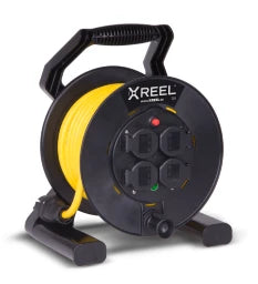 Kunststofftrommel (schwarz) mit zentral angeordneter, innenliegender BremsvorrichtungAbgedichteter AnschlussraumStabiles Kunststoffgestell (schwarz) mit ergonomisch geformtem Tragegriff und 2 Befestigungspositionen für den SteckerZentralscheibe mit 4 Schutzkontakt Anbausteckdosen österr./deutsch. System mit Klappdeckel und ShutterNennspannung: 250V Nennstrom: 16ASchutzart: IP541 Thermoschutzschalter1 Spannungskontrollleuchte (grün)25m Kabel gelb N07V3V3-F 3G1,5mm2Taurus2 Schutzkontaktstecker Gummi 16A 2p+PE 250V IP54 (0511-sr) nach österr./deutsch. SystemXREEL250 betriebsfertig verdrahtetRichtlinie (RoHS) 2011/65/EUNiederspannungsrichtlinie NSpRl 2014/35/EUBeständigkeit gegenüber UV-Strahlung nach ISO 4892-2Normen: IEC / EN 61242