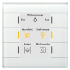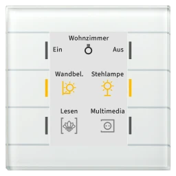 KNX Glastaster II Smart mit Farbdisplay, Weiß. Ausführung mit 6 Sensorflächen, Farbdisplay und RGB-Statusanzeige. Verwendbar als 4/6/8/12-fach Taster. Großes, aktives Farbdisplay zur Funktions- und Statusanzeige. Bis zu 12 Funktionen auf 2 oder 3 Ebenen (2x6 oder 3x4 Funktionen). Bis zu 6 Funktionen ohne Ebenenumschaltung. Mapping Funktion zur einfachen Funktionszuordnung. Patschfunktion mit erweitertem Funktionsumfang. Innovative Gruppensteuerung mit langem/extra langem Tastendruck. Erweiterte Infoanzeige mit bis zu 6 Werten in 3 Zeilen. Die Tasten sind als Tastenpaar oder Einzeltasten frei einstellbar. Einstellbare Symbole und Texte für jede Taste/Funktion. Anzeige von Statusinformationen (1 Bit) und Meldungen (14 Byte). Ein- und Zweitasterbetrieb für Schalten, Dimmen, Jalousie, Werte. RGB Status-LEDs einzeln je Ebene ansteuerbar. Anzeige von Innen-/Außentemperatur und Uhrzeit. Displayhelligkeit automatisch über Lichtsensor und Tag/Nacht-Objekt. Keine zusätzliche Spannungsversorgung erforderlich. Empfohlene Montagehöhe: 1,10 ... 1,25 m (als Taster). Rahmenlose Montage in Schalterdose. Abmessungen (H x B): 92 x 92 mm. Integrierter Busankoppler.