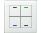 KNX Glastaster II Light 4-fach, RGBW, Temperatursensor, Weiß, Neutral. Ausführung Neutral mit 4 Sensorflächen und Temperatursensor. Umfangreiche Applikation. Die Tasten sind als Tastenpaar oder Einzeltasten frei einstellbar. Ein- und Zweitasterbetrieb für Schalten, Dimmen, Jalousie, Werte. Umschalten von bis zu vier Werten oder Szenen. Kurzer/Langer Tastendruck mit 2 Objekten. Mehrfach-Tippfunktion sendet bis zu 4 Werte auf gleiche oder verschiedene Objekte. Innovative Gruppensteuerung mit langem/extra langem Tastendruck. Patschfunktion mit zusätzlichem Schaltobjekt. Vier RGBW Status-LEDs. LED Helligkeit über Tag/Nacht- oder Helligkeit-Objekt steuerbar. 4 Logikblöcke. Einbau in Schalterdose mit mitgeliefertem Tragring. Abmessungen (H x B): 92 x 92 mm. Integrierter Busankoppler. 3 Jahre Produktgarantie.