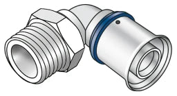 Press-Übergangswinkel mit AG zum Eindichten, aus Messing porenfrei metallisiert, inkl. Stützhülsen mit O-Ringen und Stahl bzw. Edelstahl-Presshülsen, "unverpresst undicht"