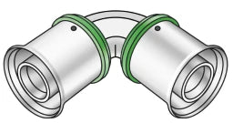 Zeta-Wert optimierter Press-Bogen 90° für Richtungsänderung mit minimalem Radius, aus entzinkungsbeständigen Messing (DZR) porenfrei metallisiert, inkl. Stützhülsen mit O-Ringen und Edelstahl-Presshülse "unverpresst undicht"