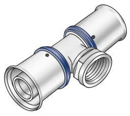 Press-T-Stück mit Abgang IG, aus Messing porenfrei metallisiert, inkl. Stützhülsen mit O-Ringen und Stahl bzw. Edelstahl-Presshülsen, "unverpresst undicht" KEINE Gewinderohre und Tempergussfittings eindrehen!