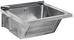 Universalwaschtrog, zur Wandmontage, Chromnickelstahl, Oberfläche seidenmatt, Materialstärke 0,9 mm, Frontschürze mit Längsriffel, ohne Armaturenbank, Ablauf mittig, mit Überlauf, mit Stopfenab- und Überlaufgarnitur G 1 1/2 B, mit hinterer Aufkantung 30 mm (H), angeschweißten Konsolen, inklusive Befestigungsmaterial.Abmessungen 520 x 270 x 490 mm (B x H x T)