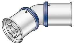 Press-Winkel 45° für Richtungsänderung mit minimalem Radius, aus Messing porenfrei metallisiert, inkl. Stützhülsen mit O-Ringen und Stahl bzw. Edelstahl-Presshülsen, "unverpresst undicht"