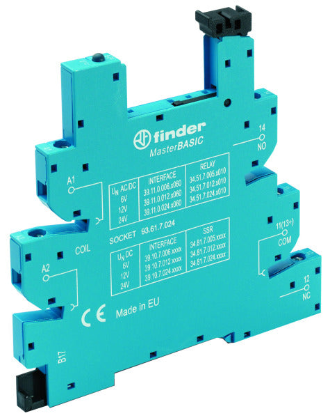 Master Basic Relaisfassung mit Schraubanschlüssen, für DIN-Schiene, Farbe blau, für Relais 34.51 oder 34.81, mit Halte- und Demontagehebel, integrierte Anzeige- und EMV-Entstörbeschaltung der Spule, 'sichere Trennung' nach VDE 0106, Teil 101 Betriebsnennspannungen 6-12-24 V DC