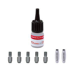 GF3 SLIM - 8-teiliges Set zum Reparieren von GF3 SLIM Glasfaserstäben Ø 3 mm. Alle Ersatzteile sind aus hochwertigem Edelstahl gefertigt. Der Spezialkleber ist sehr ergiebig. Ein Tropfen reicht für ca. 3 - 5 cm² Klebefläche. Der Kleber trocknet in nur 10 Minuten und bietet eine schnelle, einfache Lösung für Reparaturen an Glasfaserstäben. ANWENDUNGSFILM: Einen kurzen, sehr informativen Anwendungsfilm können Sie durch Scannen des QR-Codes oder auf www.runpotec.com ansehen. Lieferumfang: 1 x Spezialkleber 3 g, 5 x Endhülsen mit Gewinde RTG Ø 3 mm, 2 x Verbindungshülsen Ø 3 mm