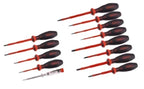 VDE-Schraubendreher-Sortiment ELEKTRO-MEGA-DRIVE-13teilig, VDE-Elektriker-Schraubendreher für Schlitzschrauben 2,5x0,4x75 mm (-Arikelnr. 11 7701), 3,0 x 0,5 x 100 mm (-Artikelnr. 11 7702), 4,0 x 0,8 x 100 mm (-Artikelnr. 11 7704), 5,5 x 1,0 x 125 mm (-Artikelnr. 11 7705); VDE-Kreuzschlitz-Schraubendreher PH 1 x 80 mm (-Artikelnr.11 7731); PH2x100 mm (-Artikelnr. 11 7732), PZ1x80 mm (-Artikelnr. 11 7741), PZ2x100 mm (-Artikelnr. 11 7742), VDE-TXdreher T10 (-Artikelnr. 11 7910), T15 (-Artikelnr. 11 7915), T20 (-Artikelnr. 11 7920), T25 (-Artikelnr. 11 1280), VDE-Phasenprüfer (250 V AC) (-Artikelnr. 11 1280)
