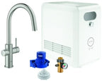 GROHE Blue ProfessionalC-Auslauf Set mit herausziehbarem MousseurauslaufGROHE Blue Einhand-Spültischbatterie mit FilterfunktionEinlochmontageDrucktasten für 3 gefilterte und gekühlte Tafelwasserartenstill, medium, sprudelndGROHE Long-Life OberflächeGROHE SilkMove 28 mm Keramikkartuscheherausziehbarer Mousseurauslaufschwenkbarer RohrauslaufSchwenkbereich 360°getrennte Wasserführung für gefiltertes und ungefiltertes Wasserflexible AnschlussschläucheGROHE Blue Professional Kühlerliefert 12 Liter gekühltes, sprudelndes Wasser pro StundeFarbdisplay mit Drück- und Drehregler270 Watt Kühleinheit, 230V, 50HzLautstärke im Standby Betrieb 46 dB(A)Schutzart IP 21, CE-Zeichenbenötigt Ventilationsöffnungen im Boden des KüchenschranksAnzeige und Überwachung von Verbrauchsdaten, Filter- bzw. CO2-Kapazität über GROHE Watersystems Appmit Bluetooth 4.0* und WIFI Datenkommunikationfür Apple** und Android GeräteBluetooth-Reichweite (max. 10 m) variiert je nach verwendeten Materialien und Wänden zwischen Sender und EmpfängerAdapter für Reinigungskartusche 40 434 001CO2 DruckanzeigerFilterkopf mit flexibler WasserhärteeinstellungDer für die Inbetriebnahme notwendige GROHE Blue Filter, die 2 kg CO2 Flasche (40 423 000) und die Reinigungskartusche (40 434 001) sind nicht im Lieferumfang enthalten und müssen separat bestellt werdenPassende Filter:- Filter S-Size, Kapazität 600 Liter bei 20° dKH (40 404 001)- Filter M-Size, Kapazität 1500 Liter bei 20° dKH (40 430 001)- Filter L-Size, Kapazität 2500 Liter bei 20° dKH (40 412 001)- Aktivkohlefilter, Kapazität 3000 Liter (40 547 001)- Ultrasafe Filter, Kapazität 3000 Liter oder 6 Monate (40 575 002)- Magnesium+ Zink Filter, Kapazität 400 Liter bei 17° dGH (40 691 002)Systemvoraussetzungen AppleiPhone mit iOS 14.0 oder höherSystemvoraussetzungen AndroidSmartphone mit Android 10.0 oder höherMobile Endgeräte und die GROHE Watersystems App*** sind nicht im Lieferumfang enthalten und müssen über einen autorisierten Apple-Händler/Händler/iTunes oder den Google Play Store bezogen werden.*Die Bluetooth Wortmarke und die Logos sind registrierte Markenzeichen der Bluetooth SIG, Inc. und stehen unter Lizenz, wenn sie von der GROHE AG verwendet werden.Andere Markenzeichen und Markennamen gehören ihren jeweiligen Besitzern.** Apple, das Apple Logo, iPod, iPod Touch, iPhone und iTunes sind Markenzeichen der Apple Inc., die in den USA und anderen Ländern eingetragen sind.Apple ist nicht verantwortlich für die Funktion dieses Gerätes oder dessen Übereinstimmung mit Sicherheitsstandards und regulativen Normen.*** Kostenlos im iTunes oder Google Play Store erhältlich.